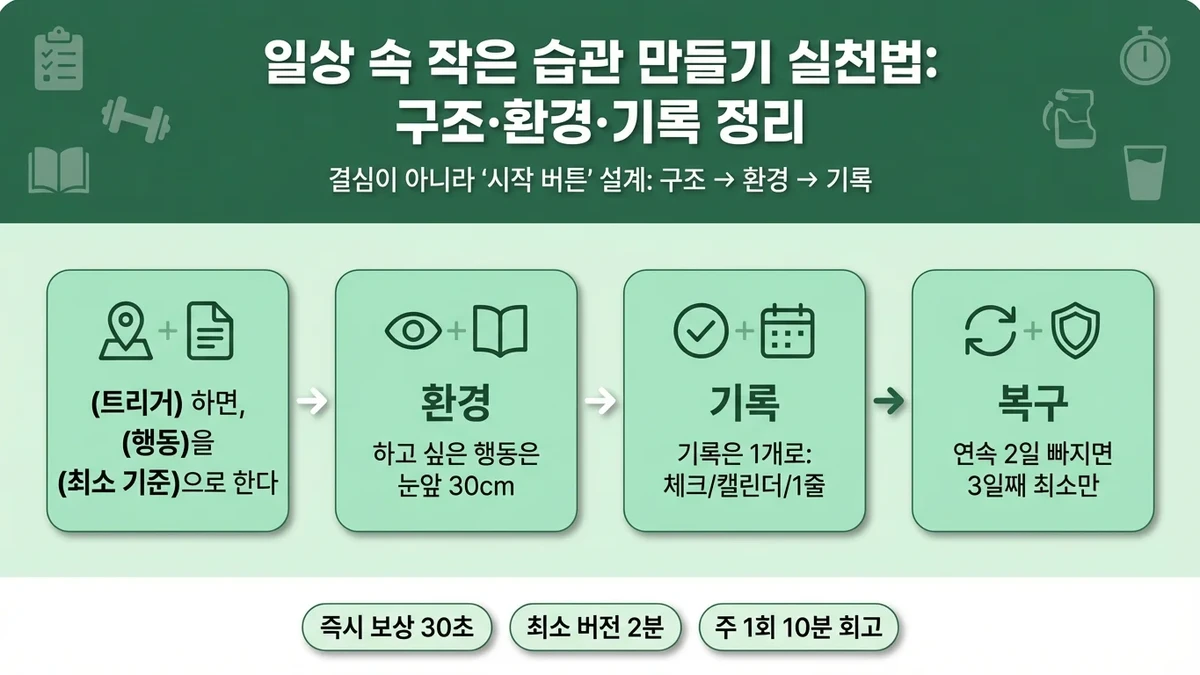 - 명확한 시작점: "언제-무엇을-어떻게" 한 문장으로 습관 정의 (예: 점심 식사 후, 물 한 잔 마시기)